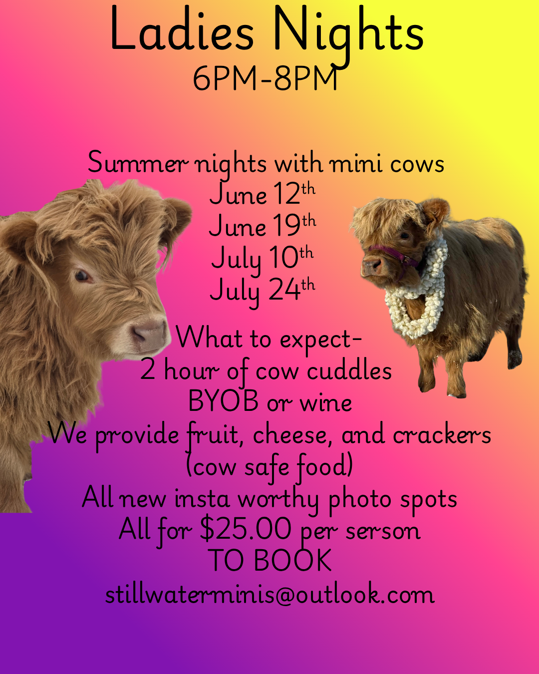 Follow us on FB- Still water mini highlands for all of our pop up events and fun farm happenings